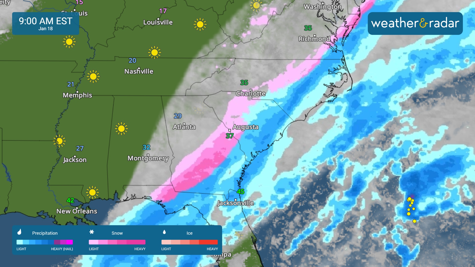 The WeatherRadar shows rain turning to snow on Sunday morning. Light snow could stretch from the Florida Panhandle through South Georgia and into the eastern Carolinas.