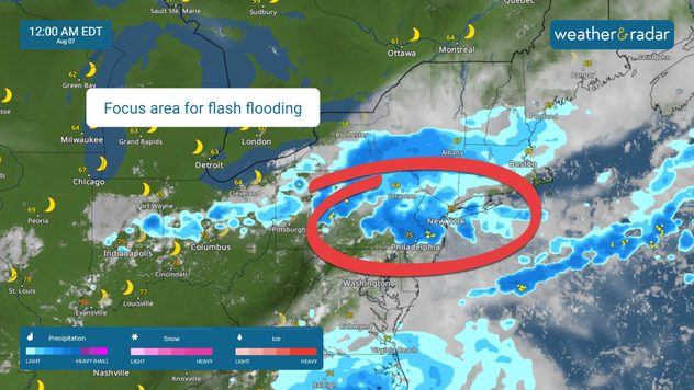 The WeatherRadar shows showers and thunderstorms moving across the Northeast. The red circle denotes the area at highest risk for flooding Tuesday night through Wednesday.