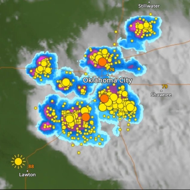 supercellThe WeatherRadar image shows a cluster of supercells moving across the Oklahoma City metro area during the afternoon hours of April 19, 2023. You can use the WeatherRadar to spot supercells as they are associated with frequent lightning (yellow and orange dots) and intense rainfall (dark blue and purple shading).