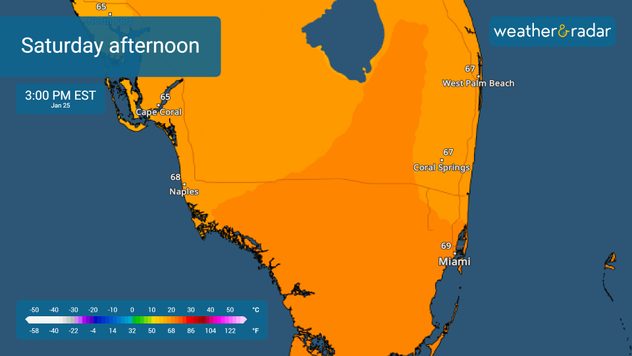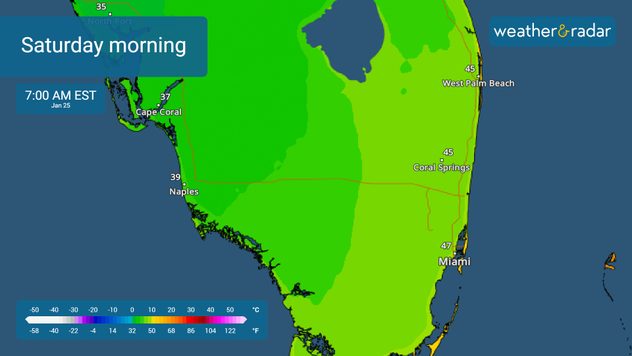 Sluggish Iguanas are possible on Saturday morning, and given the chilly temperatures, we can’t rule out an isolated falling Iguana or two. Temperatures across South Florida will be below 48 degrees around sunrise on Saturday. Highs will struggle to reach 70 F, and hardly any humidity in the air.