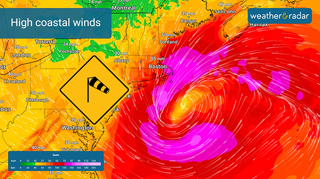 Coastal areas of New England could see wind gusts in excess of 55 mph through today.