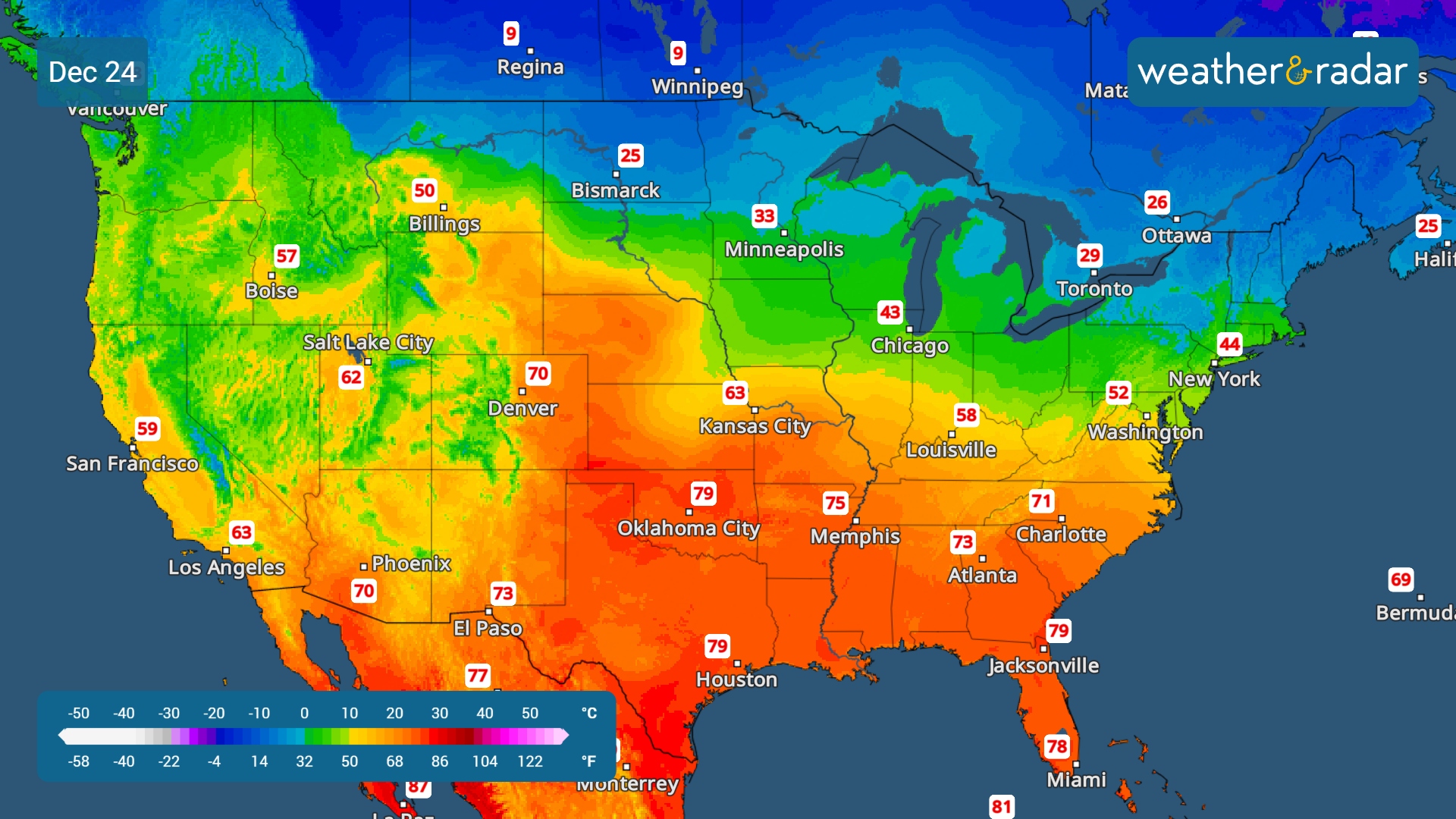 Unseasonably warm air will mean potential record highs scattered across the central and southern Plains, the Intermountain West and into the Southeast. It could be the warmest Christmas on record in dozens of cities, as highs surge into the 60s, 70s and even 80s.