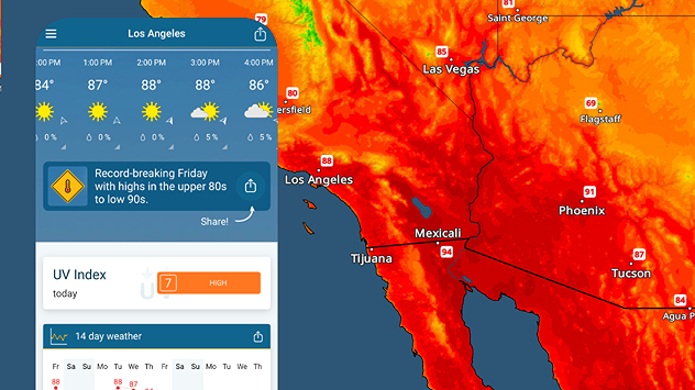 The TemperatureRadar shows afternoon highs will be in the upper 80s and low 90s throughout southern California, the Southwest and the southern Great Basin. Los Angeles, San Diego and Phoenix could all set new temperature records.