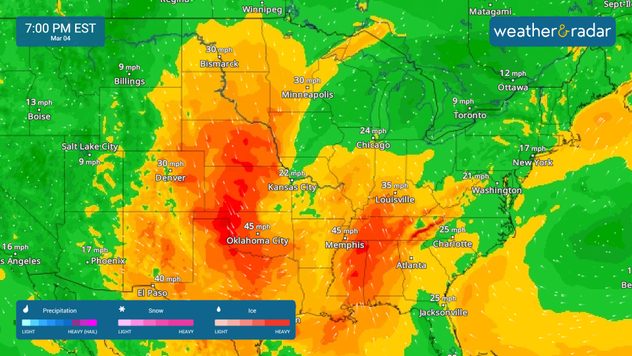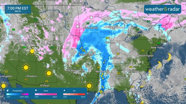 The WeatherRadar shows a powerful storm moving across the central part of the country, bringing multiple hazards, including severe storms, damaging high winds and the threats of flash flooding and blizzard conditions.