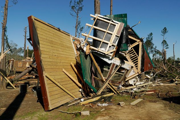 The frame of this mobile home is wrapped around a tree following Saturday's tornado that struck the Paradise Ranch RV Resort in Tylertown, Miss., Sunday, March 16, 2025. (picture-alliance AP Photo/Rogelio V. Solis)