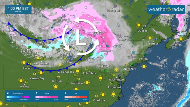 Another storm arrives in the eastern portion of the Great Lakes through the Northeast to close out the week. This system is coming from the central region of Canada, and it is moving fast. Most of the snow will fall over the northern Great Lakes in the afternoon, but after sunset, the snowfall will fall over much of north Pennsylvania and New York and move onto New England by midnight.