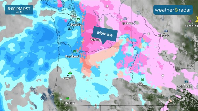 The WeatherRadar shows the Pacific storm system that brought the ice to Oregon yesterday sliding into Washington and Montana Wednesday afternoon and evening. While the freezing rain will taper off Wednesday morning, heavy snow will spread across the interior Northwest through the rest of the day.