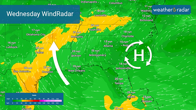 The impetus for this week's stormy weather is high pressure building over the Southeast. As the WindRadar shows, strong southeasterly winds will bring a humid airmass from the Gulf northward into the southern Plains and the lower Mississippi Valley.