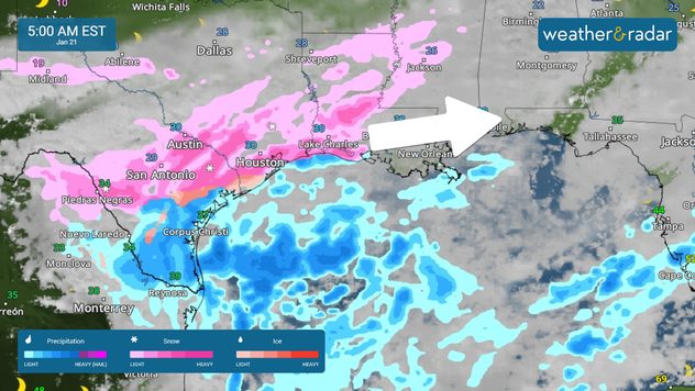 Starting in eastern Texas, the storm is expected to push eastward across the Gulf Coast and Southeast through Wednesday morning, bringing wintry conditions to areas that don't typically see it. Areas north of Interstate 10 are the most likely to see moderate to heavy snow.