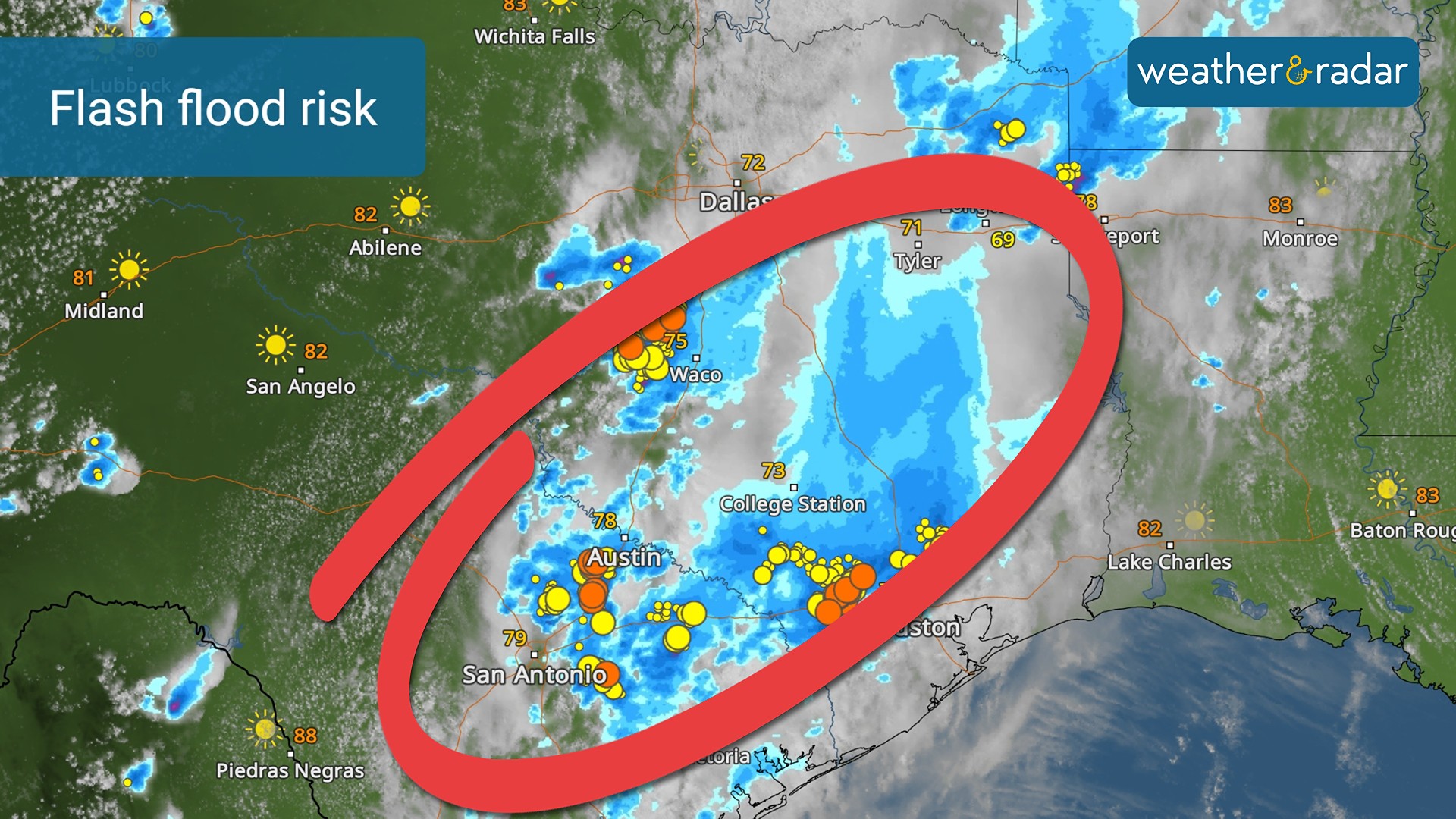 Meanwhile, Texas faces the risk of storms bringing hail, destructive winds, and a few tornadoes through the evening. Additionally, because the ground is quite saturated from yesterday’s rain and today's heavy rainfall, flash flooding is possible in San Antonio, Austin, Waco, College Station, Houston, and the surrounding areas.
