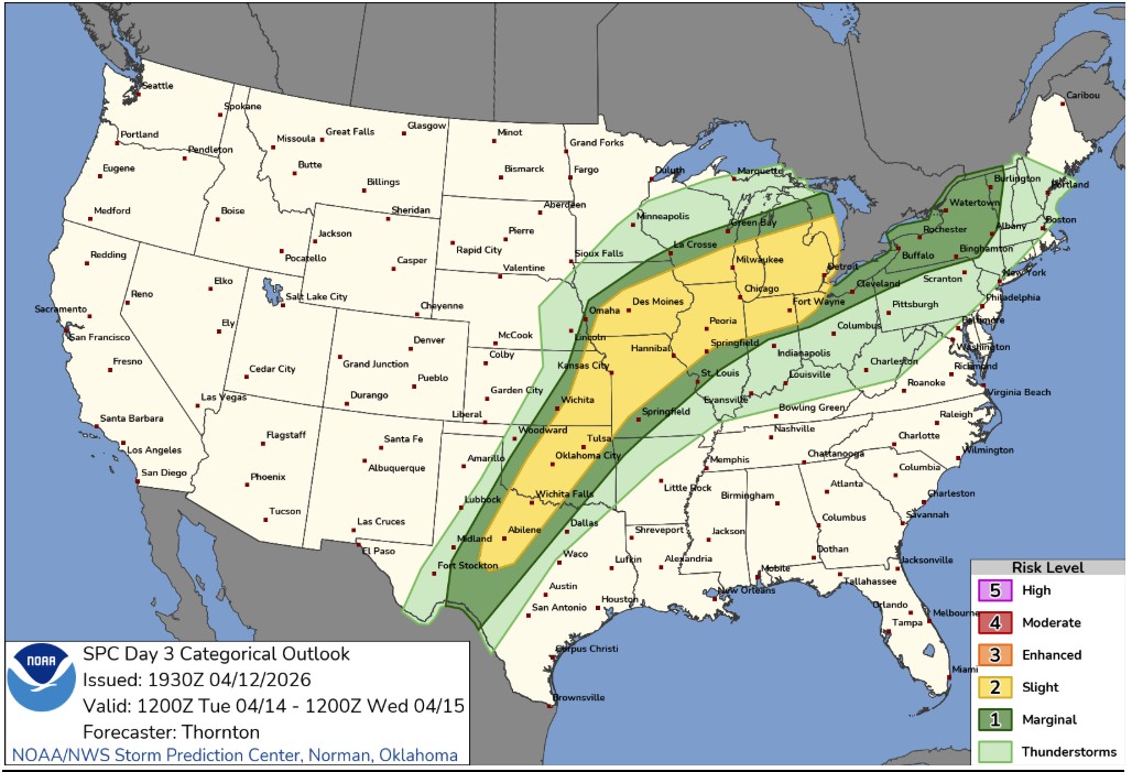 Meanwhile, in West Texas, isolated severe storms will once again be possible as another system moves into the central part of the country starting Monday. This same system will intensify as it moves out of the Rocky Mountains on Tuesday and Wednesday, bringing a risk of storms over a wide area, from the Great Lakes to northern Texas. Chicago, Kansas City, Oklahoma City, and Abilene should be on alert, as the risk of storms will be present, with a possible tornado between Tuesday afternoon and early Wednesday morning.